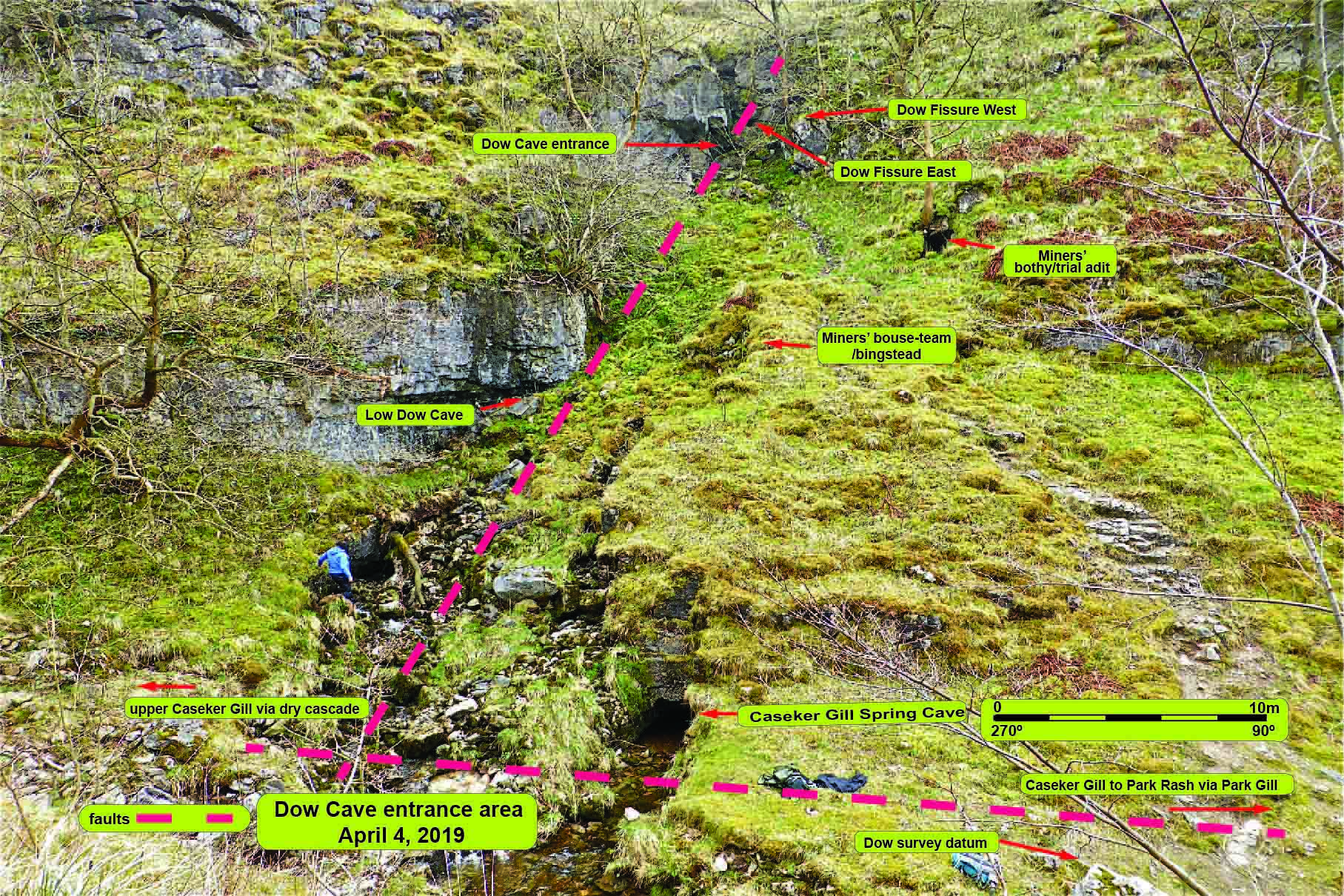 Fig. 1: Annotated image of the area around the entrance to Dow Cave |