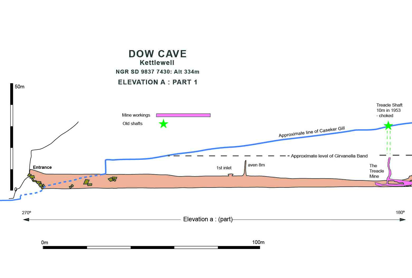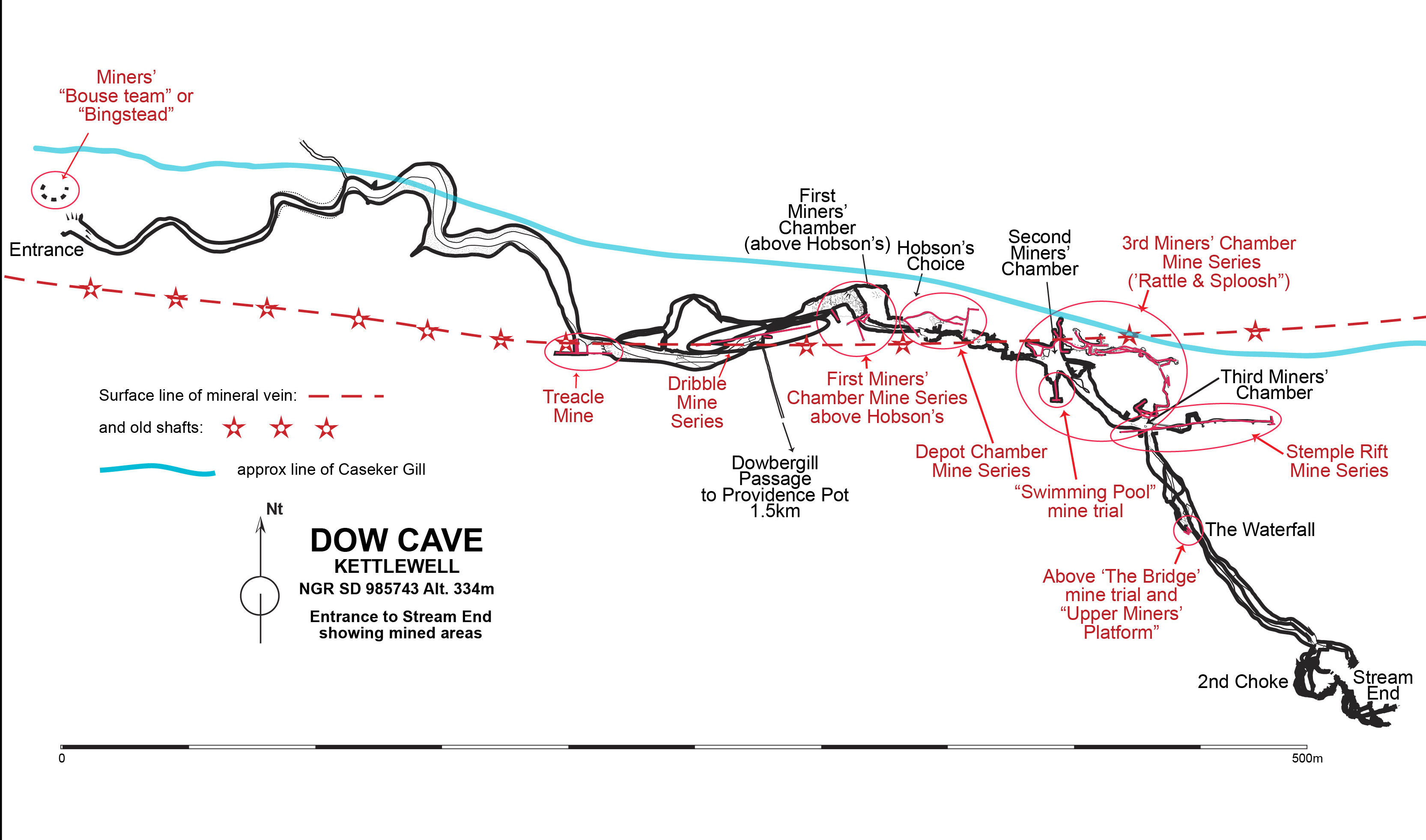 In June 1953, an engineer from Keighley thought it would be a good idea to spend a day exploring Dow Cave near Kettlewell: it happened to be Tuesday, June 2 - Coronation Day. John Hobson: “On the Tuesday of Coronation week, I entered Dow Cave, a venue dictated because I was alone and without tackle. After reaching the end of the known section, an easy enough walk, I attempted to follow the stream under the boulders but the way was too tight. My attention was then drawn to crevices on the right and, in one of them, there was a draught although a rockfall barred entry. On June 28th I returned to Dow Cave, this time with a friend, a crowbar, and the adage “Where there's a wind, there's a way’”. The rest of the story not only became caving history, it engendered a whole new school of exploration around Kettlewell, principally by Hobson’s fellow members of the Craven Pothole Club. Within the next three weeks some quite remarkable passages had been explored in the “Caseker Gill Extension” with a grand stream passage, cascades, a great profusion of stalactite and stalagmite formations, flowstones and crystal pools, but with many secluded corners some of which to this day conceal hidden gems. By the end of the following year yet another mile or so of new passages had been explored, not only from the end of the known cave, but from a previously little known side passage first recorded, in fact by members of the Burnley Caving Club and referred to as “PG Passage”. This was the now infamous Dowber Gill Passage leading to what is in essence the completely separate cave system of Providence Pot. Fig.1 shows the general geography of the area around Dow Cave entrance and Fig.4 some aspects of the geology. Norman Thornber’s original, and somewhat misleading, description of Douk Cave, Kettlewell (also called Dow Cave) in Pennine Underground, 1947. stated: "Once an old lead mine, but a very good cave. A ledge can be followed for some distance, but stream has to be entered. Roof lowers to four feet, stream flowing between thirty feet wide silt bed. Three hundred yards in on the left, mine level can be seen. Main passage ends in chamber thirty feet high, thirty feet wide, and fifty feet long". Dow Cave is a most remarkable cave in its own right with a wide variety of features that are helpful in understanding how this cave and others in the vicinity have been formed and developed on the geological time scale. It is a wonderful cave with many outstanding features, well worth a visit by the connoisseur of the unusual. Records of Dow Cave prior to 1953 are almost non-existent other than some often fanciful accounts from writers and travellers of the Victorian and Edwardian eras. The entrance is hidden away in a limestone scar in the otherwise rarely visited Caseker Gill, itself a place of great interest, not only to the rock-hound, but also to any nature lover. Fig 2 shows the location of Dow Cave but it is difficult of access by any standards and there are no footpaths beyond that leading to the cave entrance. Certainly the lead-miners of the 17th century knew all about this cave: they were following a mineral vein, Caseker Gill Vein, both from the surface above the cave and from inside the cave itself. This vein contained workable quantities of the valuable mineral galena, a rich source of lead and much sought after for water pipes and roofing sheets for the incipient industrial revolution. The attached plans show the extent to which these miners have exploited the resources of the area. Unfortunately, there seems to be very few records of their activities in or around Dow Cave in the mining records although such records do exist for many of the nearby gills and moorlands: For example the Old Providence Vein was exploited from Dowber Gill, and well documented, and the remains of the Kettlewell smelt mill show that lead mining activity once played an important part in the economy of the area. Fig 3 illustrates the location of some of the mined areas and Fig 18 shows the location of mined areas seen in Dow Cave. Some other caves in the area such as Scoska Cave and Dowkabottom Cave did receive attention from early explorers. Dowkabottom was the location of a major archaeological exploration in the middle of the 19th Century when large quantities of human and animal remains, and artifacts, were excavated. Scoska Cave also attracted much interest as we are reminded when we see inscriptions on the wall inside the cave by William Coates of Mile House dated 1841 and Henry Dean of Litton dated July 21, 1845. The 18th Century archaeologists also investigated Heights Cave near Bordley and Elbolton Cave near Cracoe. An early account of Dow Cave came from William Howson in 1850 when he wrote of Dow Cave as “a series of lofty chambers, narrow passages and several branch passages”. A little later B J Harker of Grassington wrote: “Somewhere about 1852, another cavern which is called Douk Cave was discovered ………its height is from three to 20 yards and its breadth 20 yards and upwards. You may walk in an upright position through most of its passages: down the middle flows a pellucid stream and from the top and sides hang numberless petrifactions of the most grotesque shapes. A human skeleton was found in it …” |