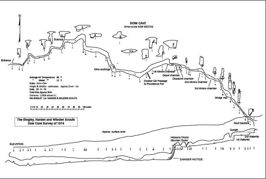 Fig.7 Plan and elevation of Dow Cave made by 6th. Bingley 1st Harden and Wilsden Scouts 1974 |