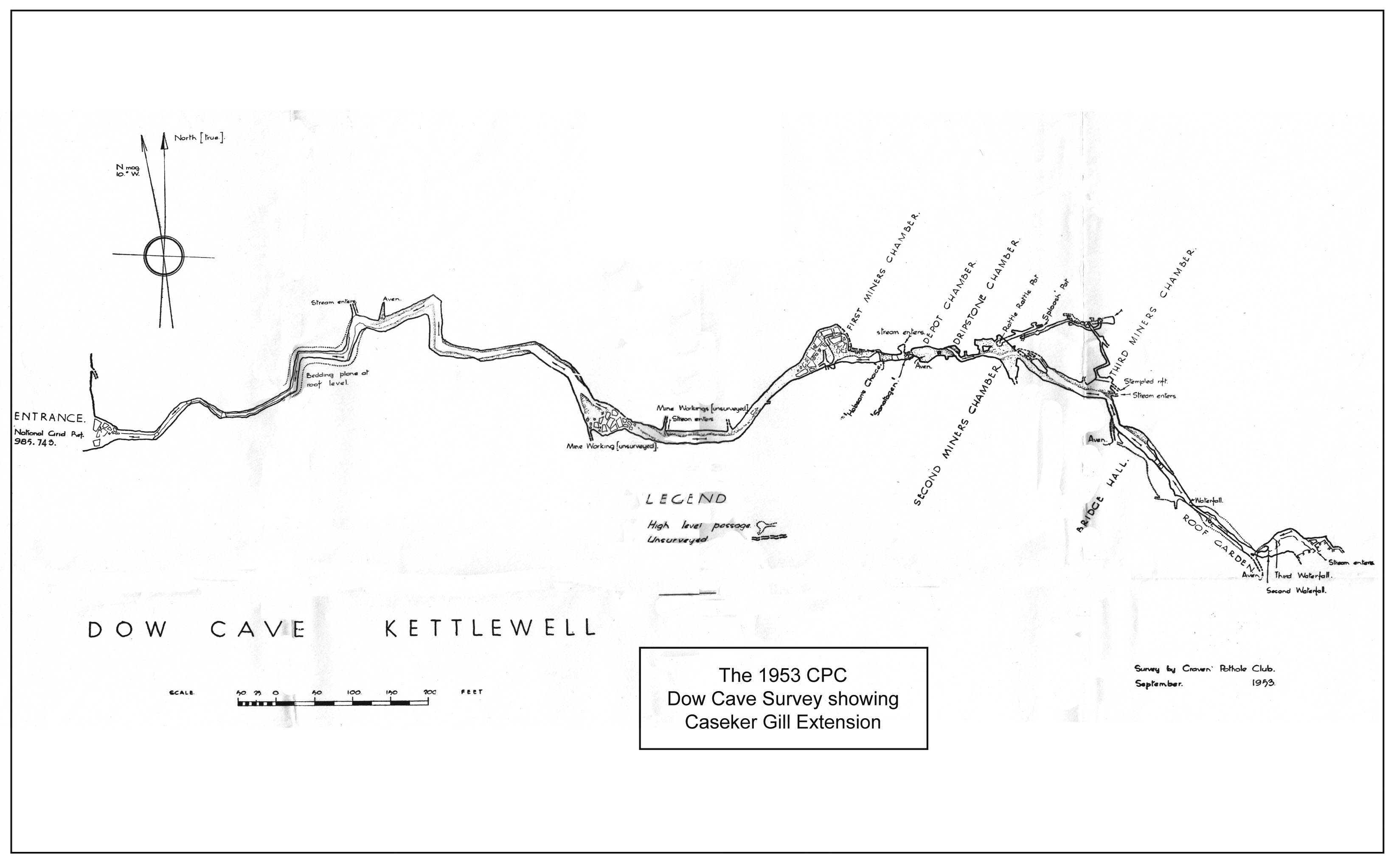 Fig. 8 The 1953 plan of Dow Cave including the Caseker Gill Extension. Made by Dennis Brindle et. al. |