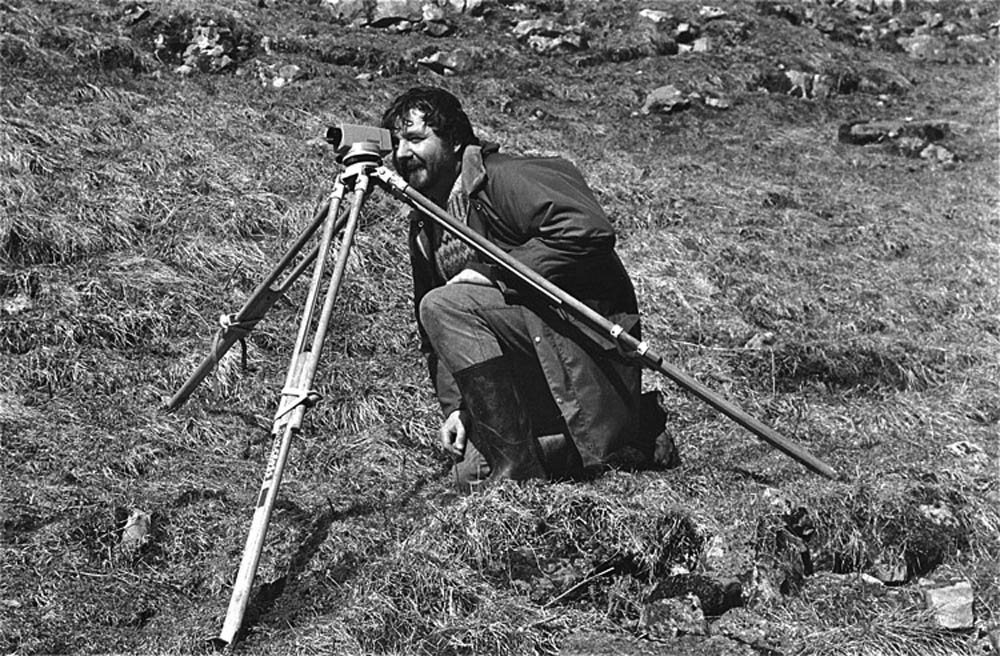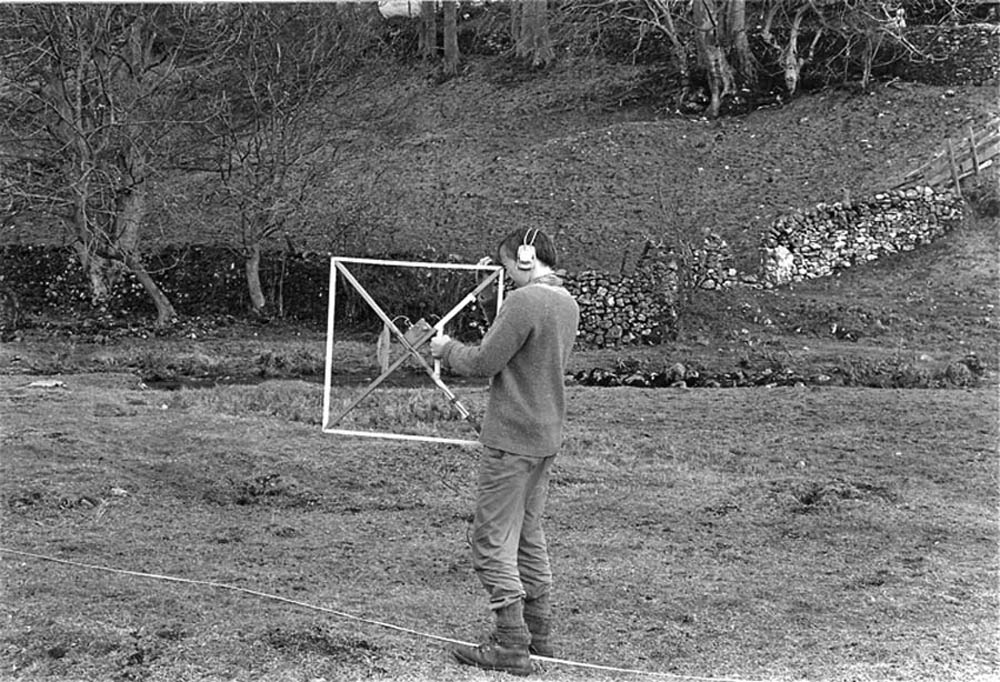 In the same week several sites were identified as suitable for "radio location" using a magnetic induction device. Patrick Warren is shown calibrating the device on a flat field at the foot of Dowber Gill. Photo SEW March 31 1986 .