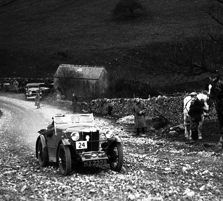 Dow Cave, in a remote corner of Wharfedale, was a long way from the traditional potholers’ hunting grounds around the Three Peaks and it was not often visited but, in the 1930’s, Park Rash, the nearest road access to Dow Cave, was a very popular venue for the motor sport enthusiasts. Having a gradient of 1 in 3 on the steepest bend, and being un-surfaced until the late 1940’s, it was one of the great challenges for the “Hill-climb” enthusiasts. The attached image from those days was very kindly provided by Chris Lambert of ‘Pre-war Minor Network’, courtesy of Zoe Schafer of ‘Motor Sport Images Ltd’. | ||