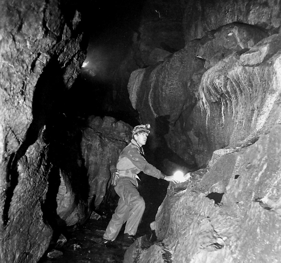 These pages concern the surveys made over the past years since a start was made on the complete resurvey of Dow Cave in 1982. A great number of people have helped with this work and further information will be found in later sections. Prints from surveys online will be available in due course. Meanwhile hard copies of all surveys are available at cost from the author. Please enquire using the e-mail address below. Left: the author in Dow Cave c 1960.