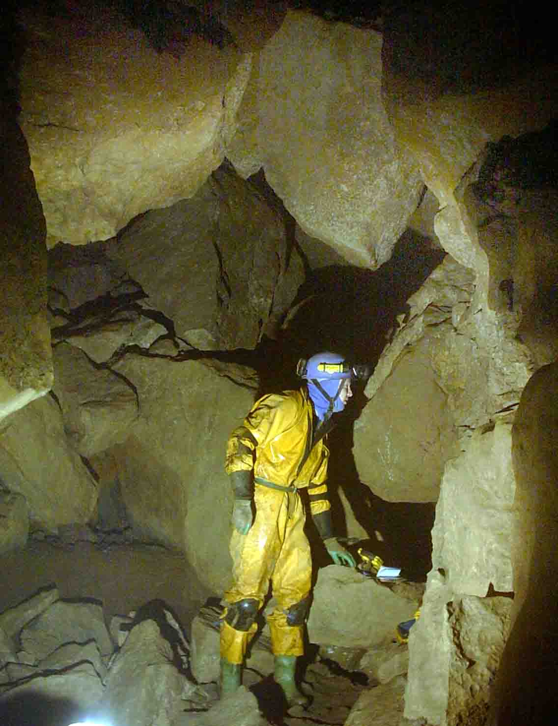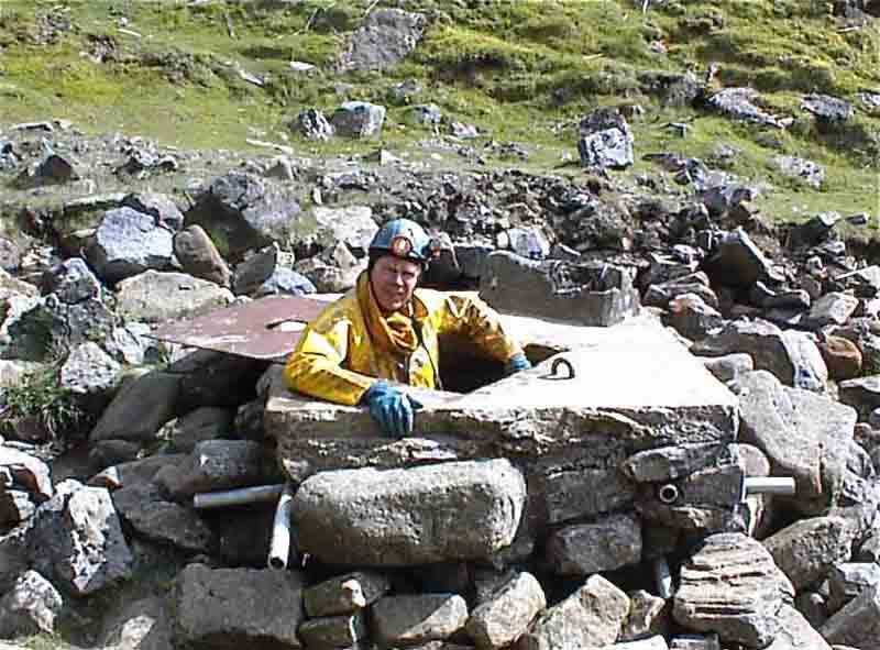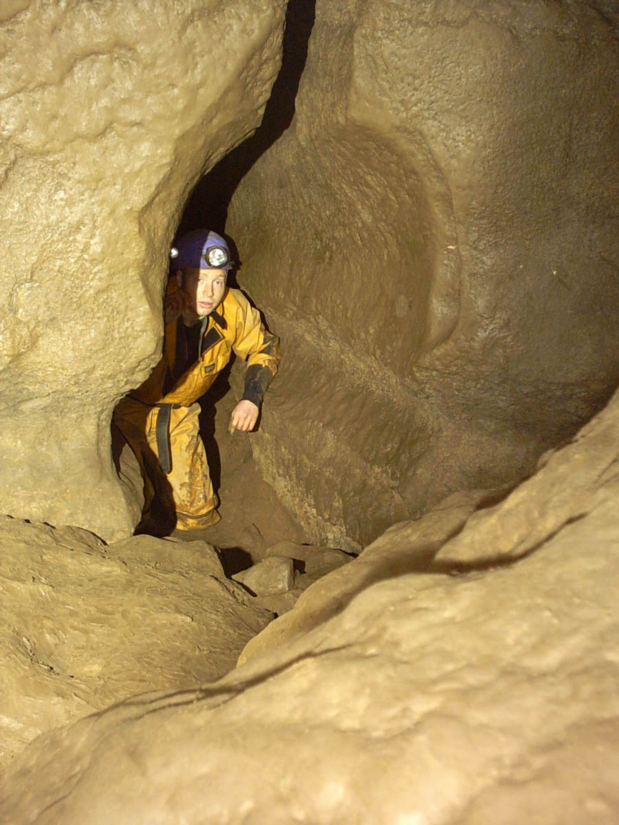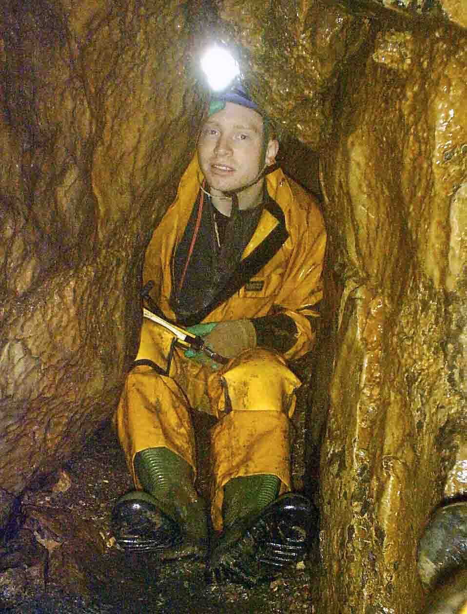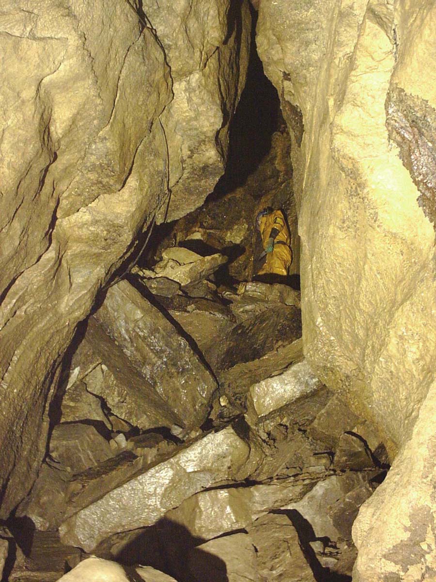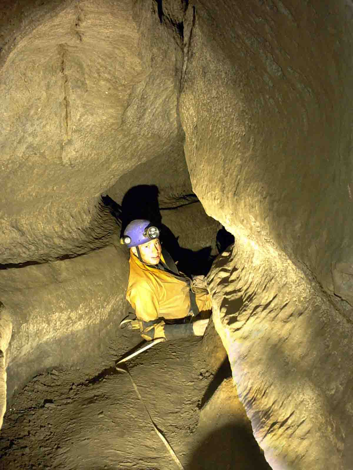 The entrance to Providence Pot (NGR 99212 72889 Alt. 395m) is located in Dowber Gill, a tributary to Cam Gill which flows into the River Wharfe at Kettlewell. The entrance is in the Yoredale beds well above the Girvanella Band and a little below the level of the Dirt Pot Grit. A public footpath is shown on the OS map the full length of Dowber Gill from Kettlewell as far as Providence Pot. Whilst there is no right of access to descend Providence Pot, it has enjoyed unhindered access since first explored in 1954. The present concreted entrance and scaffolded shaft was constructed by members of the Yorkshire Subterranean Society in 1967. Photo by A Cole May 3 2004. All other pictures below by SEW |