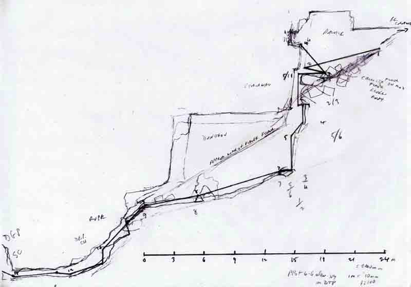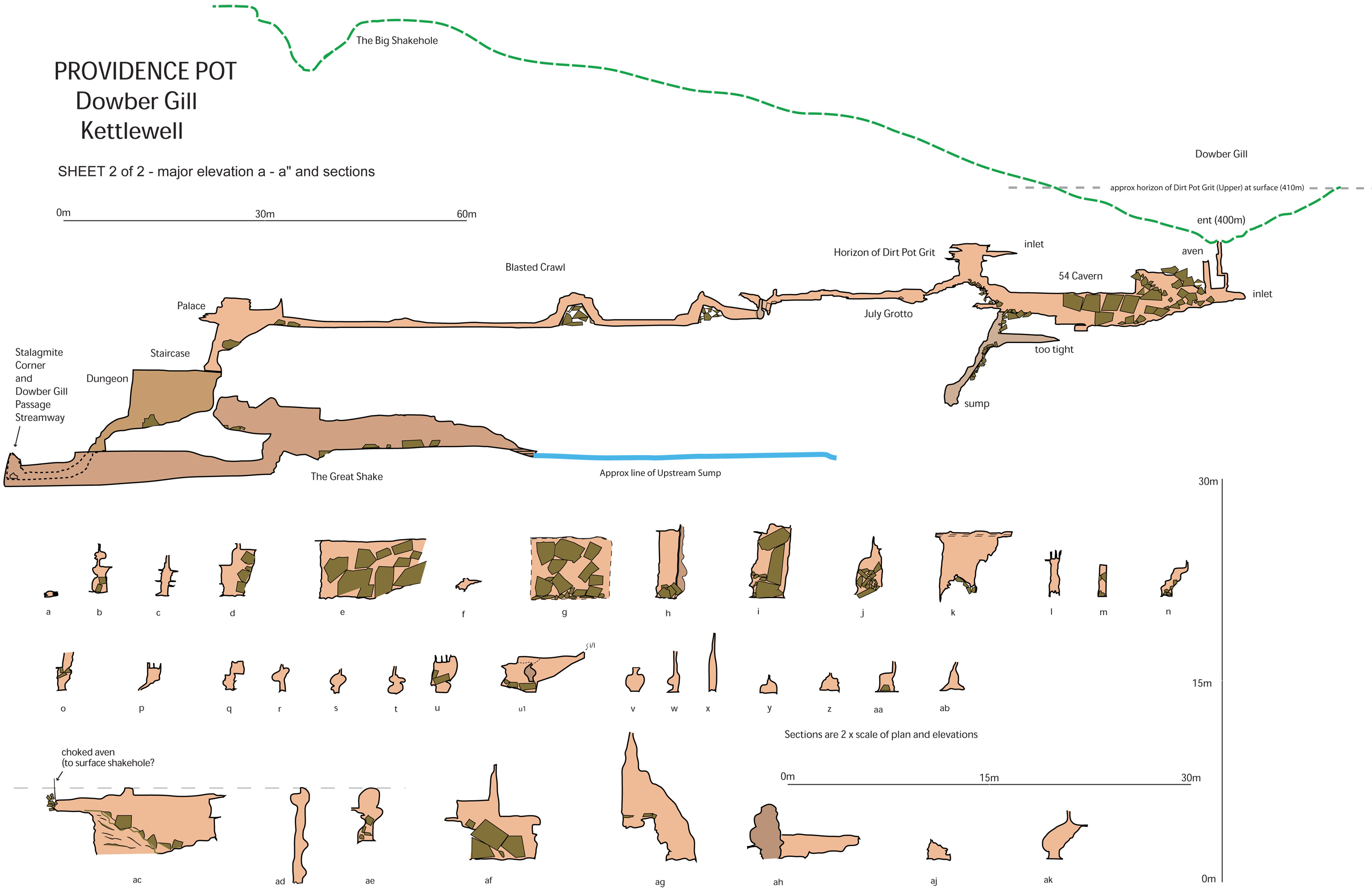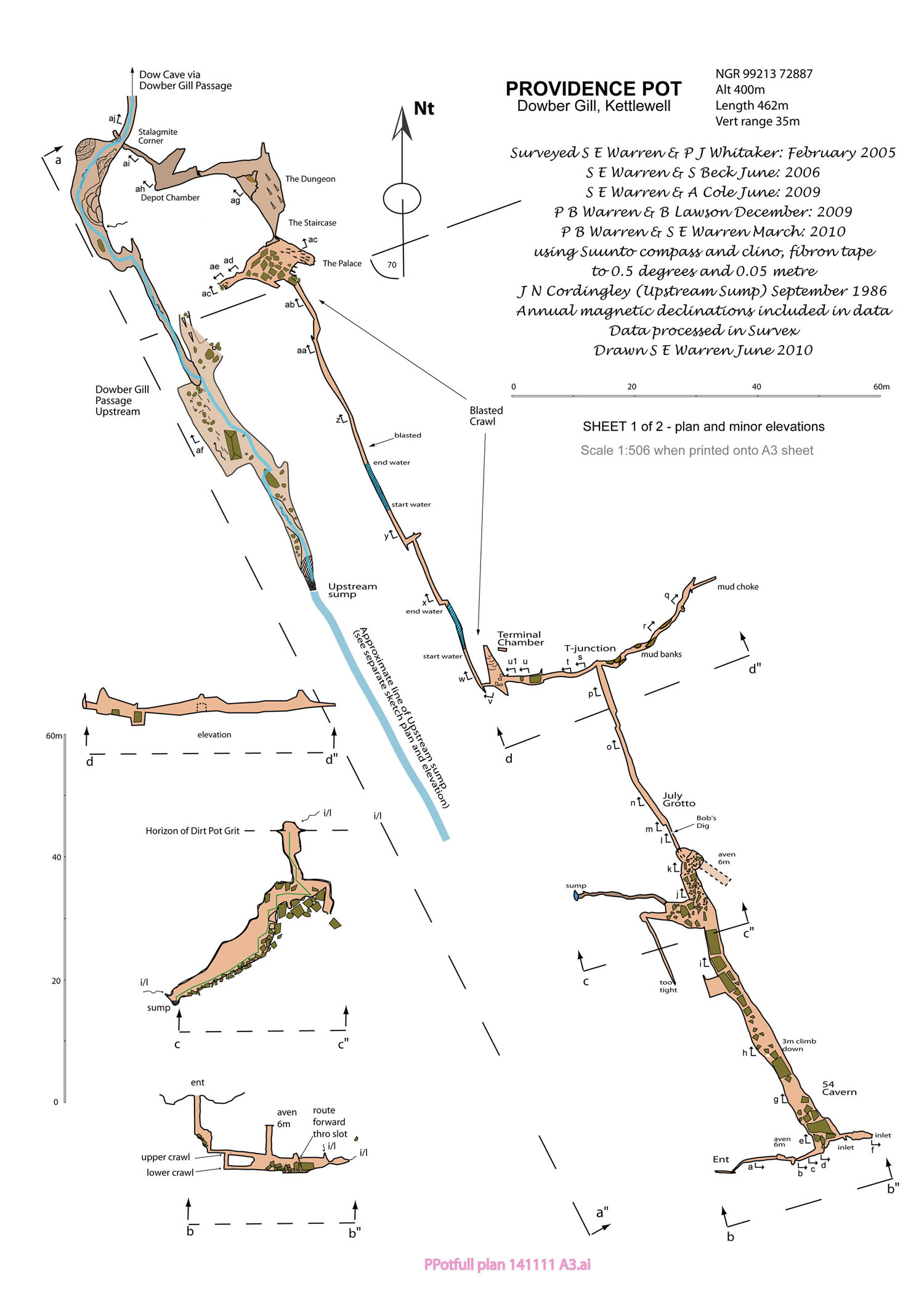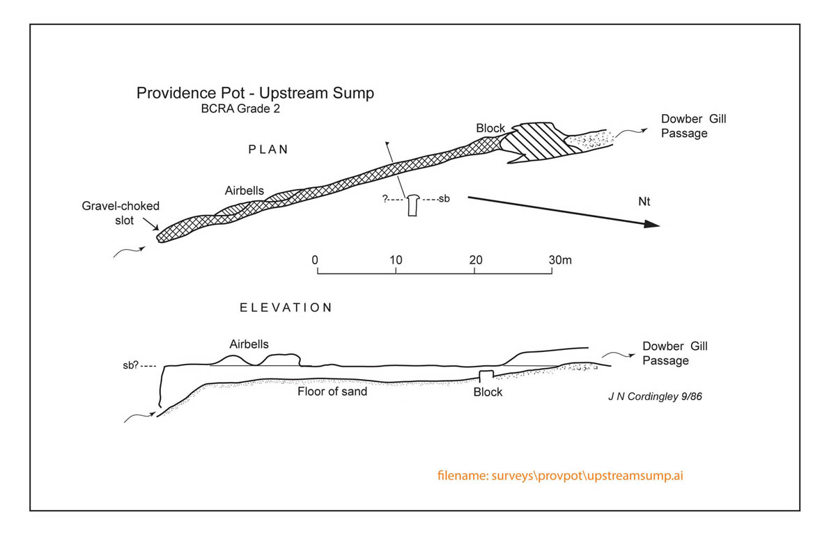 Providence Pot comprises a series of larger caverns connected by small or very small sections. A principal feature of Providence Pot, in caving terms, is the "Blasted Crawl", a miniscule joint controlled passage between Terminal Chamber and The Palace - see plan and elevation below. This connection made in 1955 resulted in the noted, or notorious, through trip between Providence Pot and Dow Cave via Dowber Gill Passage. The waters of Dowber Gill beck sinking by the entrance are seen only briefly underground, immediately below the entrance series, where they disappear into impenetrable fissures. In October 1953 flourescein dye was introduced at the sink and spotted as "the green messenger" at the Dow Cave end after a passage of approximately 7 1/2 hours. |