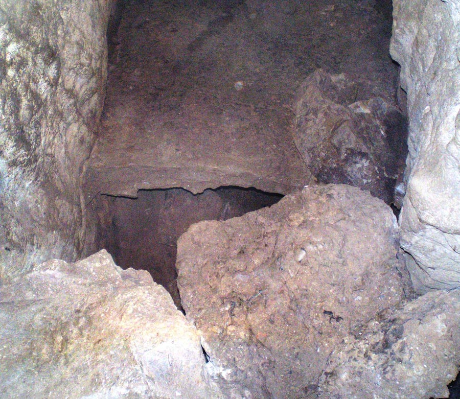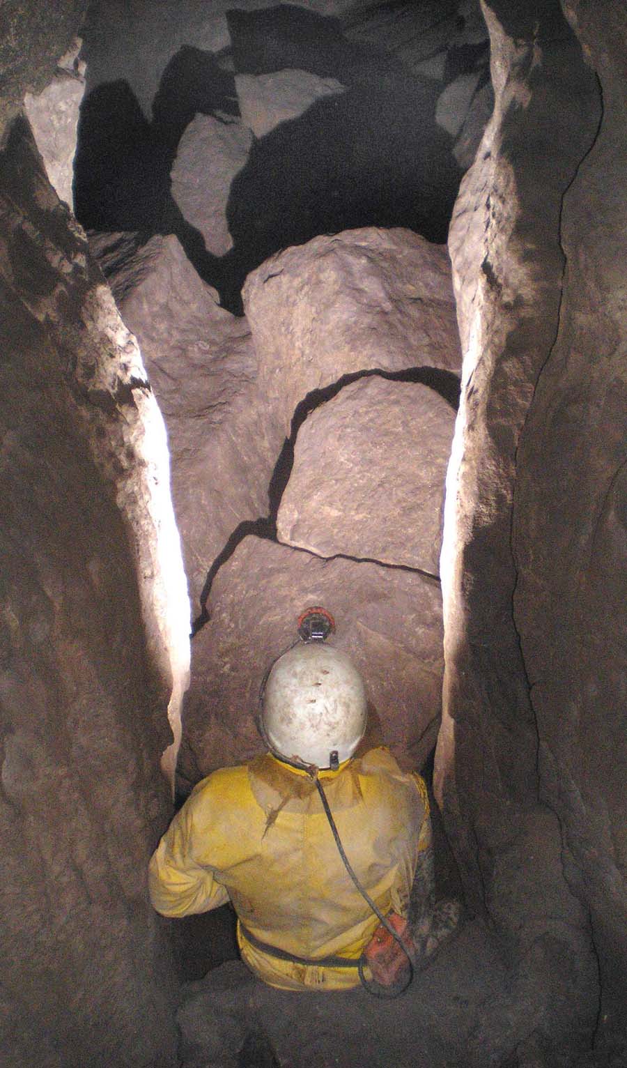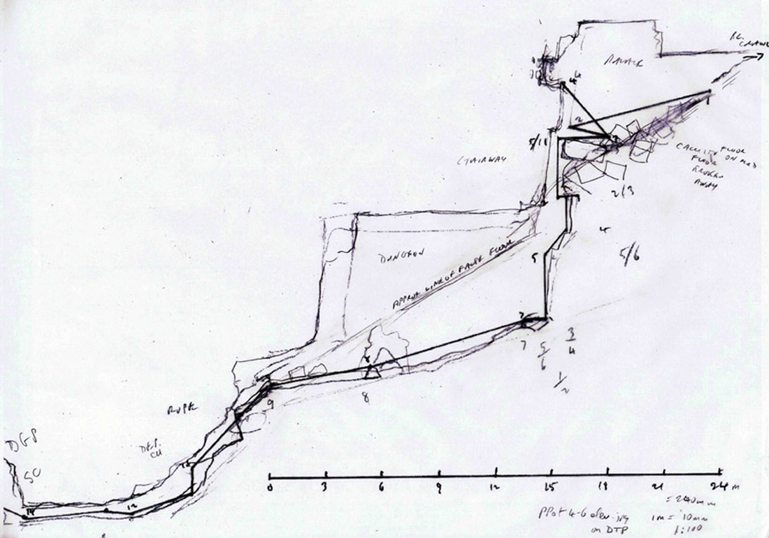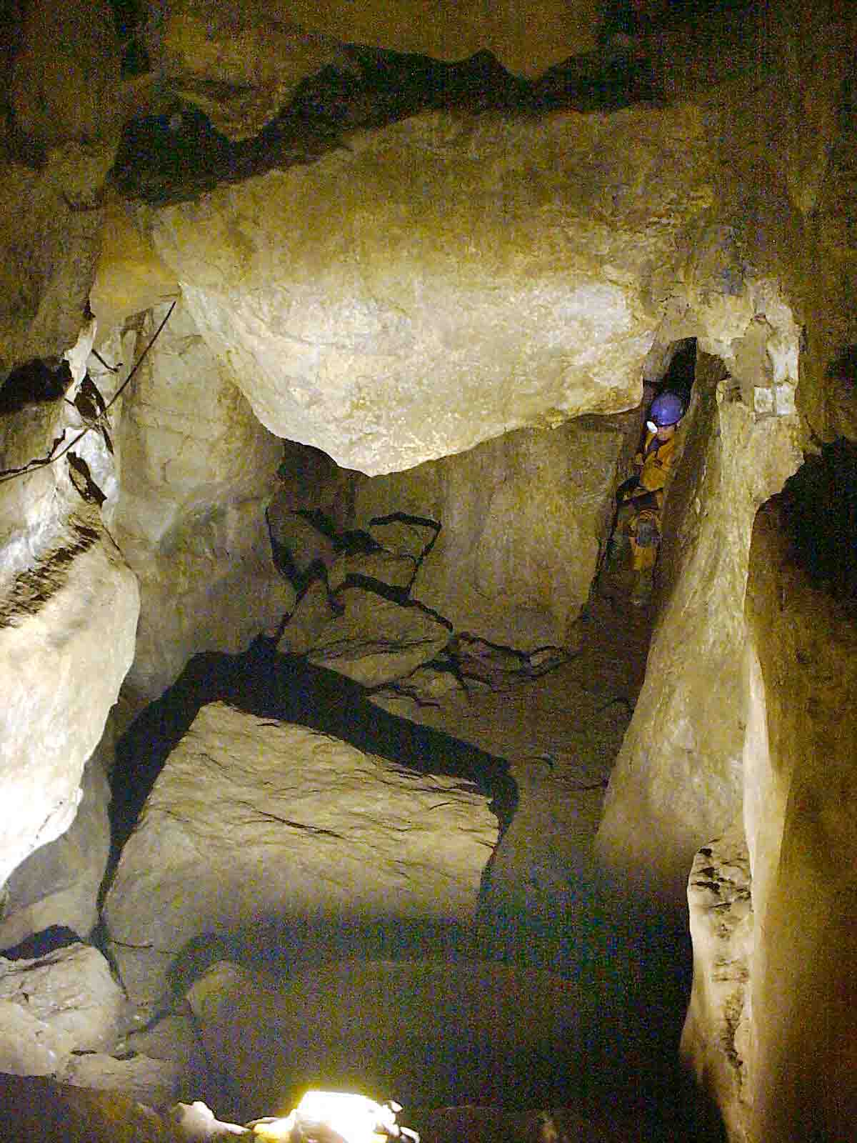 Providence Pot comprises a series of larger caverns connected by small or very small sections. A principal feature of Providence Pot, in caving terms, is the "Blasted Crawl", a miniscule joint controlled passage between Terminal Chamber and The Palace - see plan and elevation below. This connection made in 1955 resulted in the noted, or notorious, through trip between Providence Pot and Dow Cave via Dowber Gill Passage. The waters of Dowber Gill beck sinking by the entrance are seen only briefly underground, immediately below the entrance series, where they disappear into impenetrable fissures. In October 1953 flourescein dye was introduced at the sink and spotted as "the green messenger" at the Dow Cave end after a passage of approximately 7 1/2 hours. |