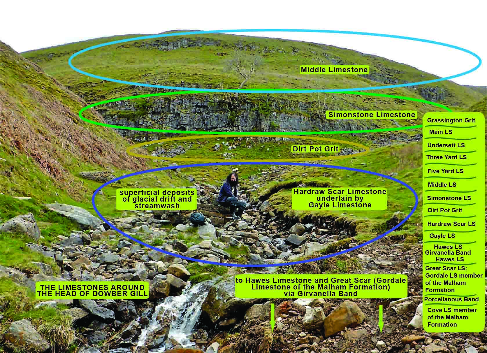 Annotated image of the arrangements at the head of Dowber Gill. The Dowber Gill stream enters the system through the lower beds of the Yoredale Series. The system breaks through the Girvanelle Band and into the Gordale member of the Great Scar Limestone Group in the vicinity of 800 Yards Chamber. |