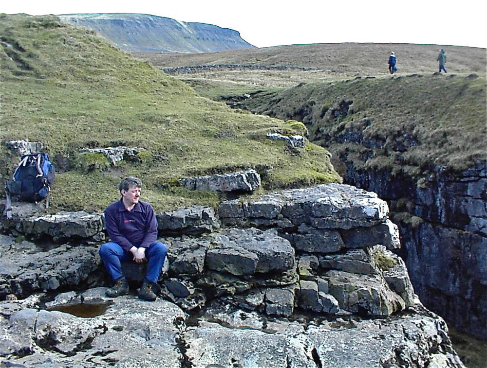 Originally described as 'almond rock' by Hughes (1900) from its appearance, the Girvanella Band (GB) is a band of very dark or black bituminous limestone containing Girvanella nodules or oncoids. The nodules represent a symbiotic intergrowth between three species of lowly plants and animals, including the alga Girvanella which forms concentric rings around shell fragments (O'Connor 1964). Garwood and Goodyear (1924) claim to have seen the band at Jackdaw Hole but this may have been an outlying fragment as it has not yet been seen. The Girvanella Band occurs at the top of the Great Scar Limestone where it is taken as the boundary between the lower limestones of D1 age and the higher limestones of D2 age, the Yoredales. Locations where the GB can be seen clearly, i.e. the Girvanella nodules are distinctive which is not always the case, and which have examined are shown on the attached sketch map Fig. 2 (not currently available - under revision} Left: Phil Ryder is sitting on an outcrop of the Girvanella Band at Hull Pot. |