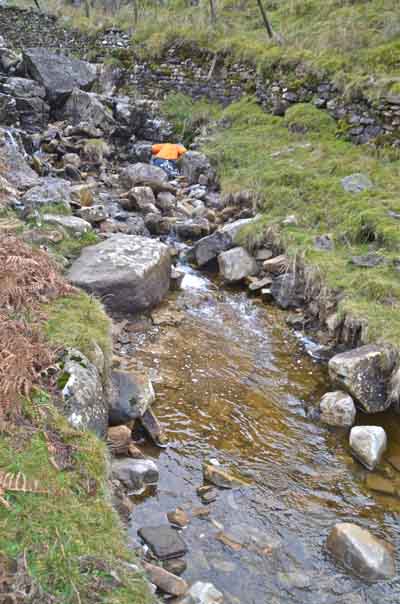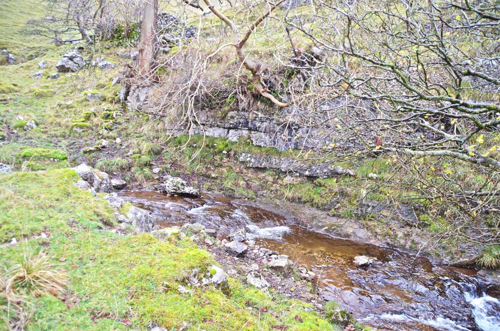 Left: a bed of dolomitic limestone was revealed at 98991 72946 Alt. 373m after stream bed deposits were washed away by the flood waters. November 19 2014 A bed of dolomitic limestone was unearthed by C Camm, R Bendall, P Ryder and S E Warrren whilst examining a spring on the limestone terrace above Kettlewell in 1998 at 98333 70322. The bed was some 0.8m thick and composed largely of a coarsely crystalline deposit when first examined. Three years later, in 2001, it appeared that the crystalline nature had changed to a much finer brown sandy deposit. It is assumed that exposure to the atmosphere had affected the deposit in some way. This is still under investigation. Other exposures of dolomite limestone occur in the immediate area. |