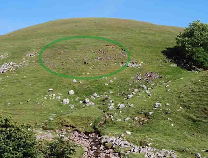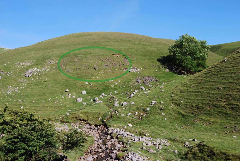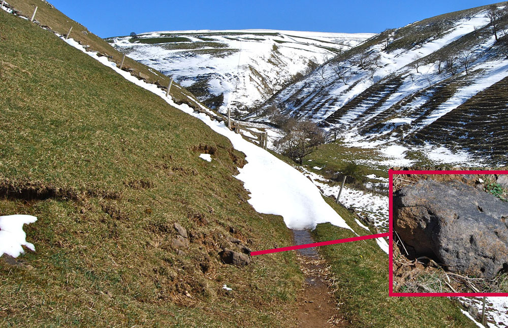 Left: another large mass of dolomitic limestone is largely concealed under vegetation but the occurence shown in the drystone wall (left) extends to the right for a distance in excess of 350m. March 2, 2012 Right: outcrops of dolomitic limestone occur somewhat randomly across the area as by the path from Park Rash to Dow Cave where it extends over a large part of the hillside. April 5 2012. |