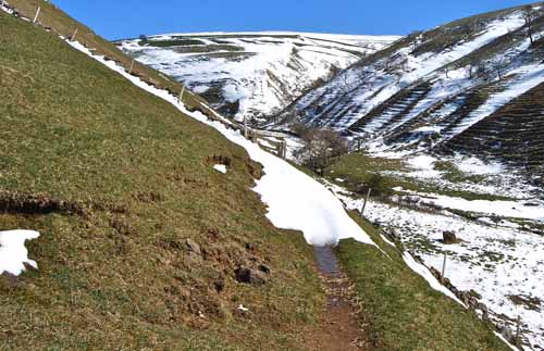 The areas of less competent strata of the Dowber Gill "Dun limestone" have given rise to the prominent well-rounded meltwater channels of lower Dowber Gill (left). March 2, 2012. These contrast quite strongly to the craggy meltwater channels in the grey limestones of the area (right). March 2 2012.