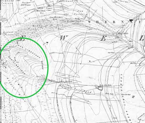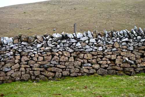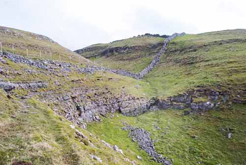 The most obvious indication of the presence of dolomitic limestone can be seen in the dry stone walls as shown here at 9797 7235 near Rain Slack. March 2, 2012. Dolomitic limestone outcrops extensively on the south bank of the lower parts of Dowber Gill. This is clearly shown on the 6 inch geological sheet 116 of 1852 as "Dun limestone". |