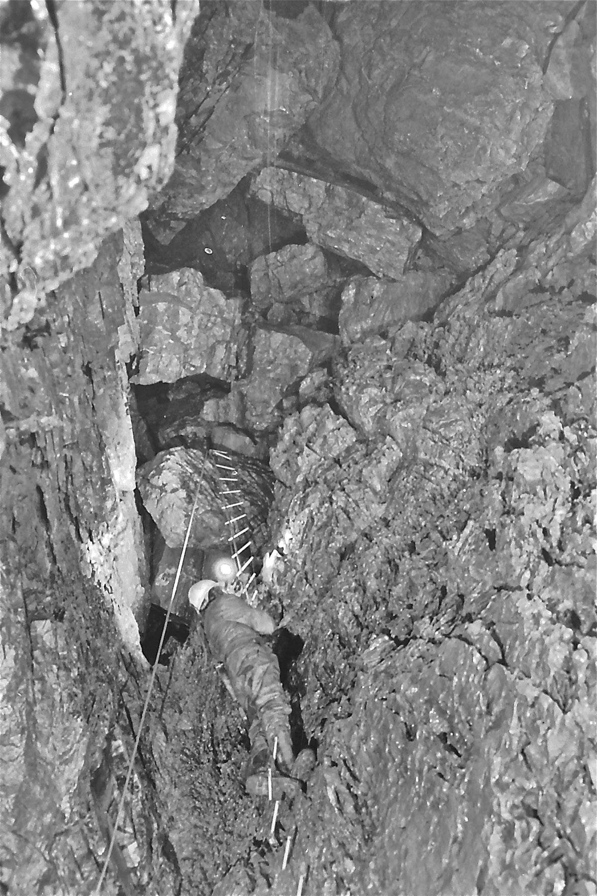 Below: amongst the minor faults is the Gaping Gill Fault that at one time was accessible via East Pot hidden away in a corner of the Gaping Gill Main Chamber. Below, Trevor Smith on the East Pot 20m ladder pitch, August 23, 1986. |