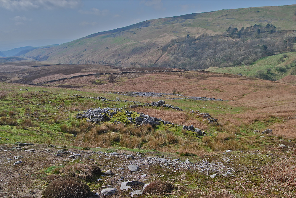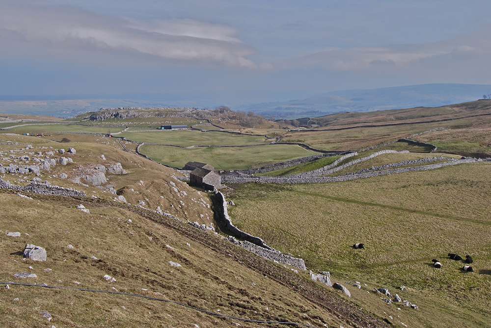 Classical Craven Fault country: looking over the lower part of Leck Fell towards Leck Beck, the Dent Fault crosses the middle ground and heads up north-east towards Bull Pot Farm and Barbondale. The limestone structures in the centre of the picture are the remains of a medieval or earlier farmstead. March 1, 2012 |