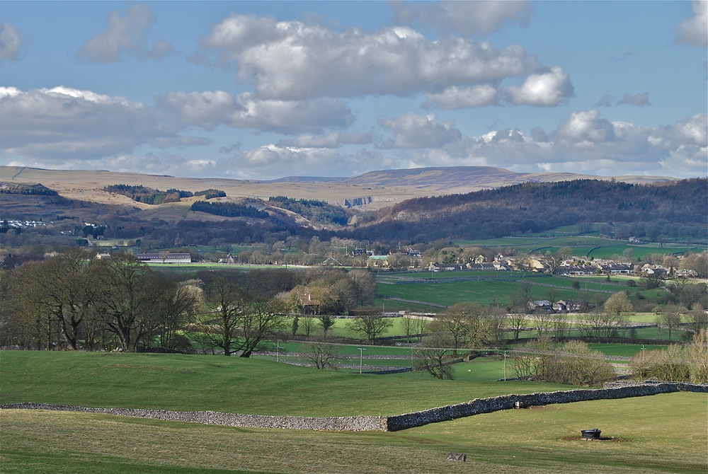 Classical Craven Fault country: the view from High Hills Lane looks over the Settle countryside with the South Craven Fault running approximately along the line of the road under High Hill to the right. Langdale Pikes in the distance. .November 11, 2004 |