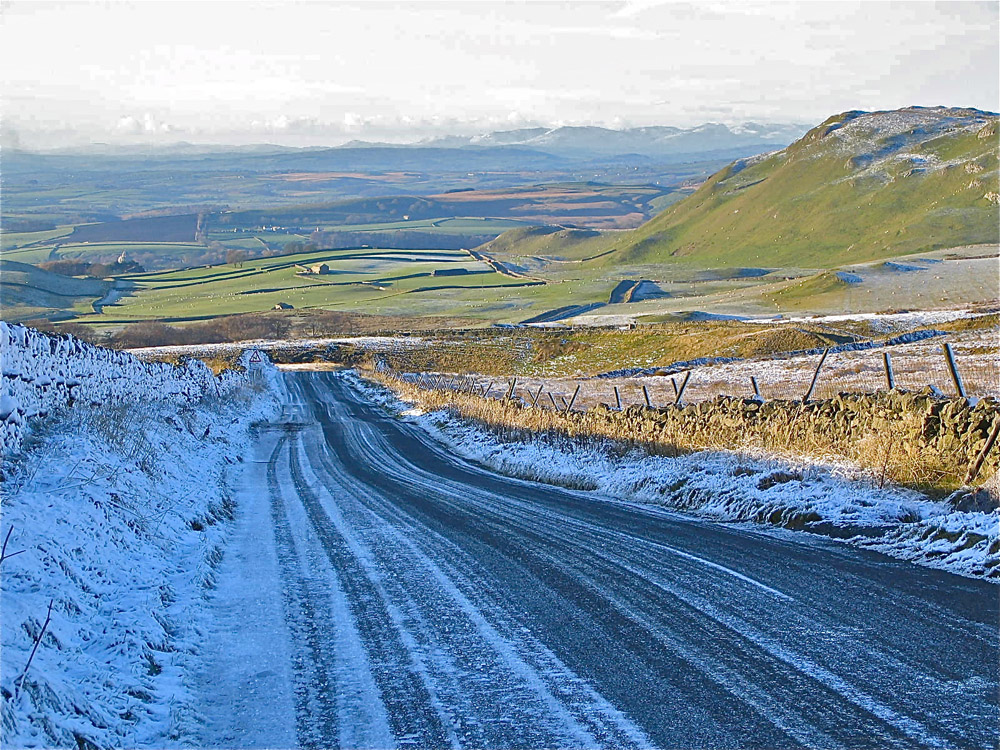 Classical Craven Fault country: looking along the North Craven Fault with Moughton Scars to the left and Jop Ridding to the right where Ordovician sandstones of the basement rocks are exposed. January 2, 2005 |