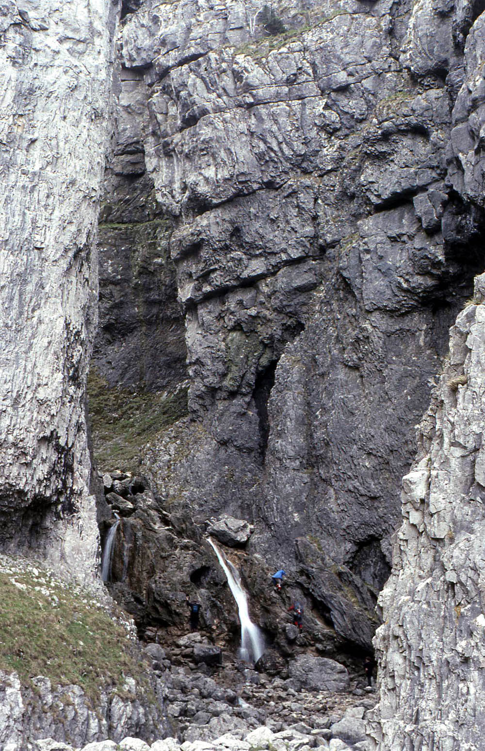 Classical Craven Fault country: The cascades of Gordale Scar allow one to penetrate deep inside the Great Scar Limestone, without going underground. This is the limestone massif between the Mid Craven Fault and the North Craven Fault. October 1995 |