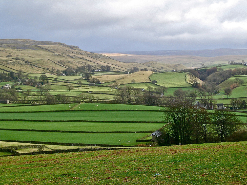 Classical Craven Fault country: This view from the Linton fields encompasses the Mid and North Craven Faults in the nearer ground, as well as the Netherside Gorge, Kilnsey Coolscar Quarry and Great Whernside. It also incidentally encompasses much of the ground in which the SIlurian erratics can be found. March 18, 2012 |