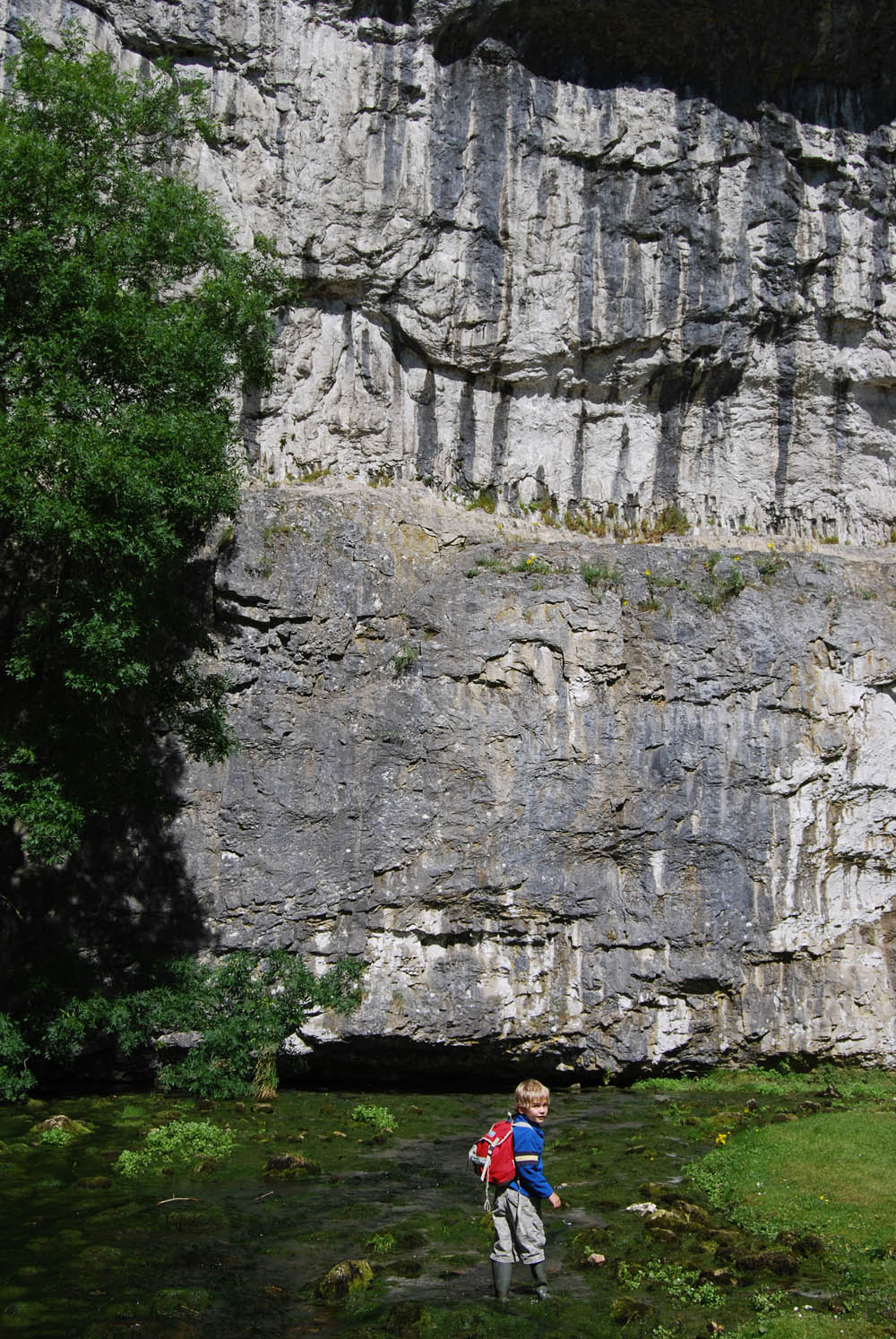 Classical Craven Fault country at its best, Malham Cove where the beginnings of the River AIre resurge after a long journey underground - through, along, or guided by, the Mid Craven Fault. August 8, 2007. |