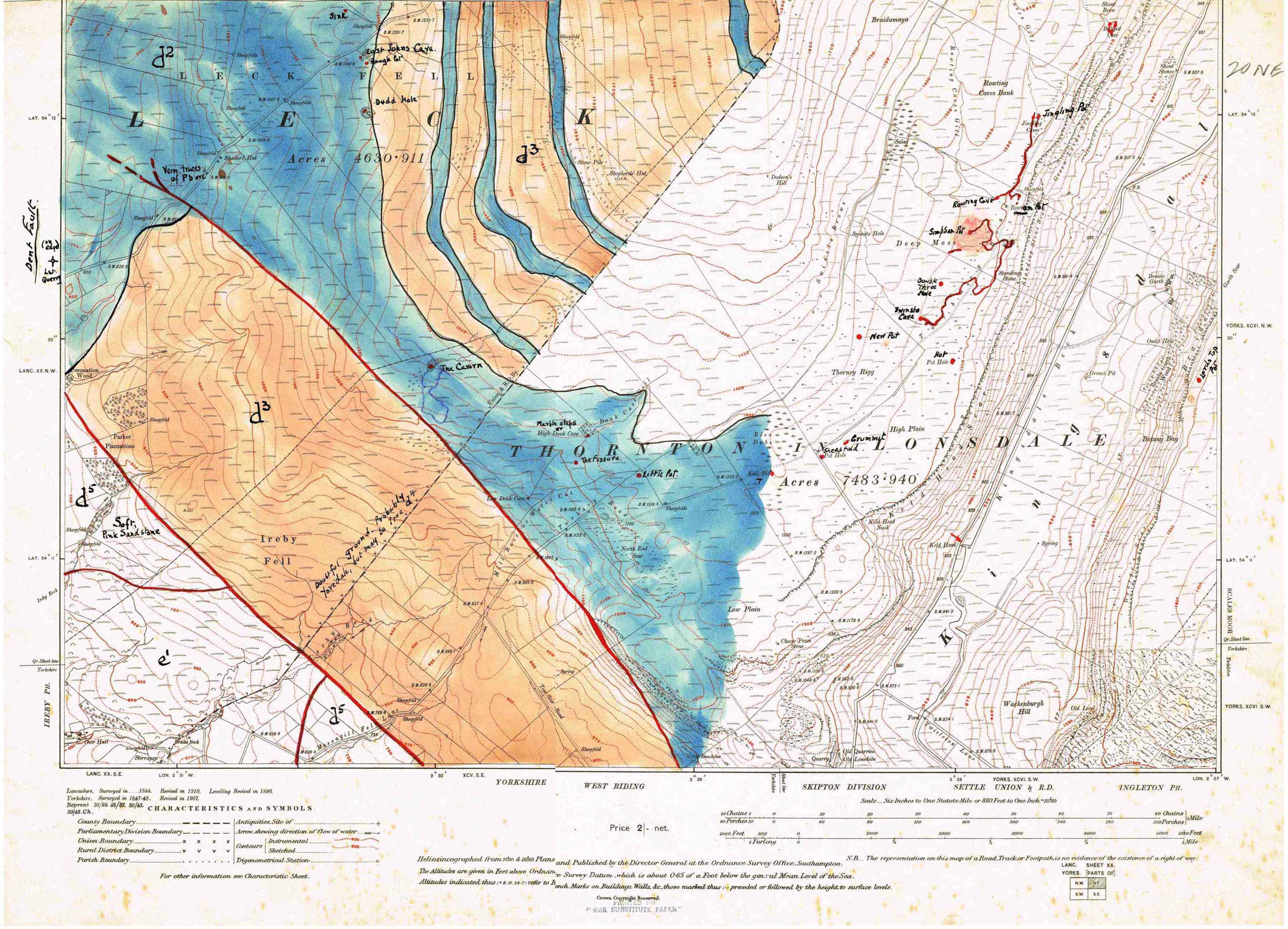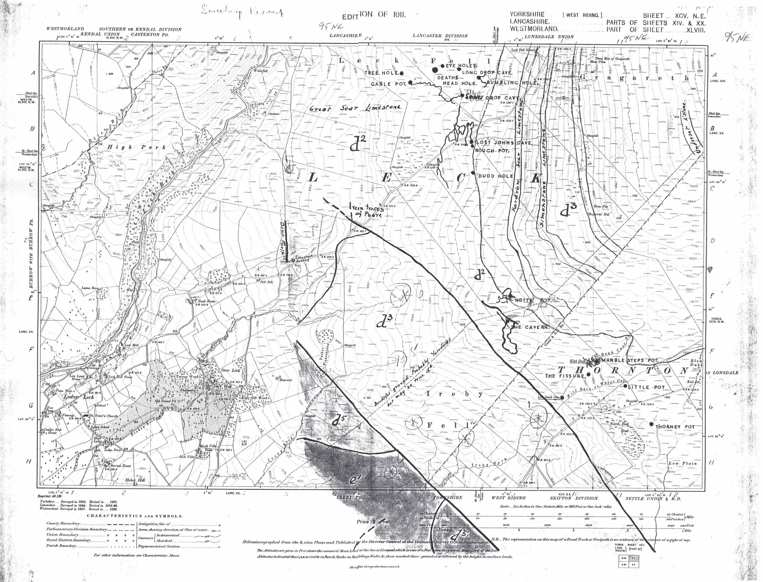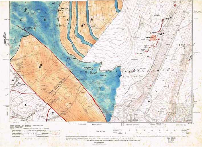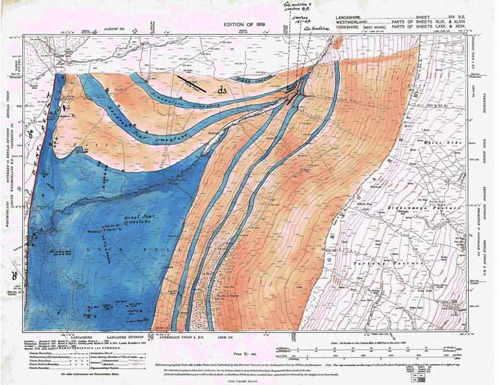 Simpson's Maps Eli SImpson could see there was a correlation between the occurence of faults and the disposition of the major cave systems. He spent some considerable time in working out these relationships by drawing the geology onto the six inch OS sheets of 1911 and 1919. | |
